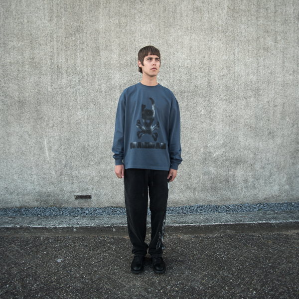 Grey loose longsleeve made of 315 g/sm cotton. With a print on the front.